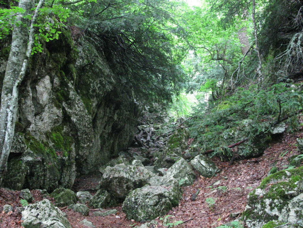 Тисовое ущелье — это, собственно, огромная (длиной более километра) трещина, отделившая от основного массива узкий, но длинный блок. Эта трещина, над которой усиленно поработали карст, эрозия, примечательна тем, что здесь еще можно встретить тис ягодный.