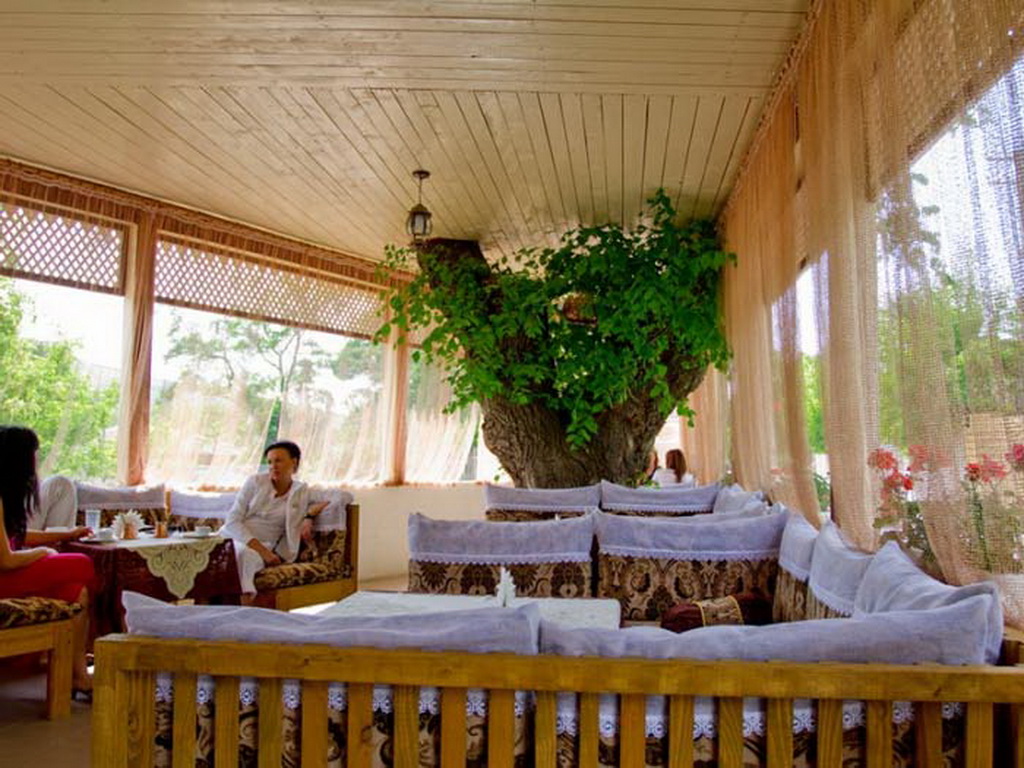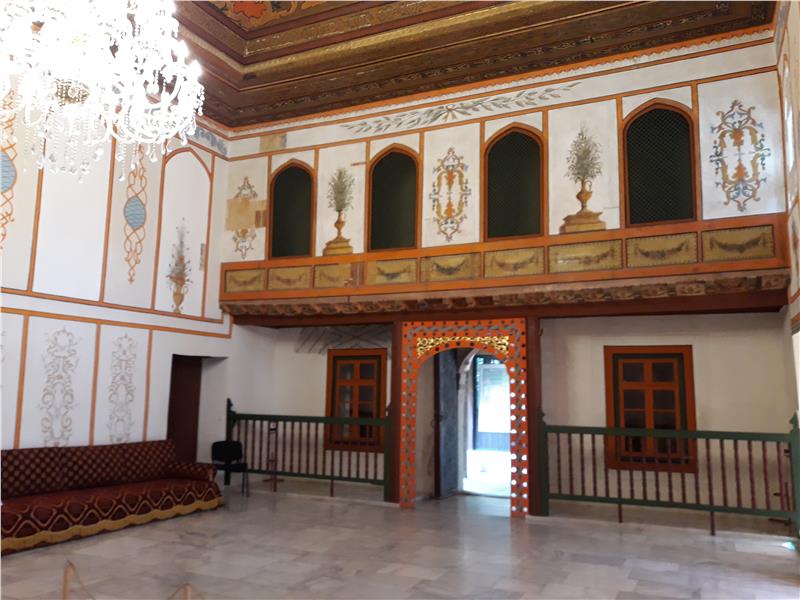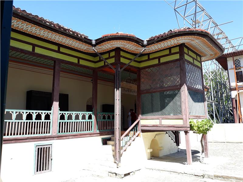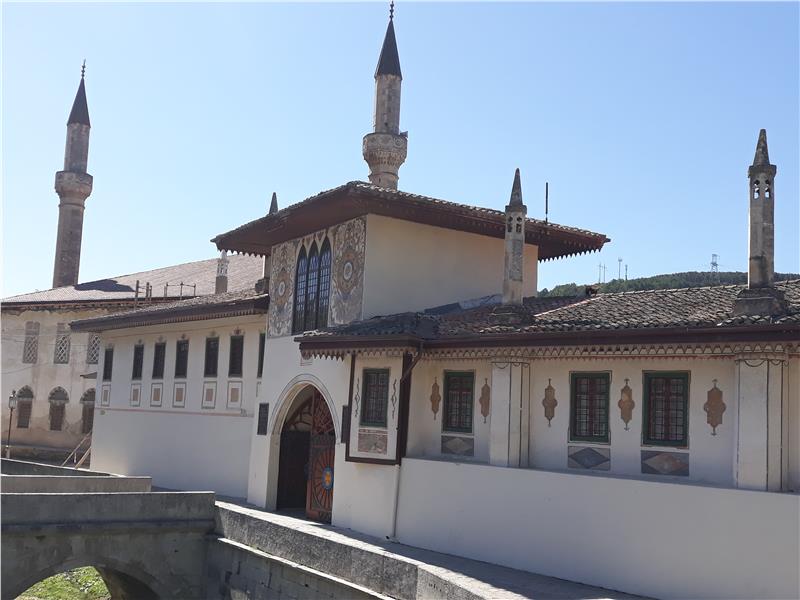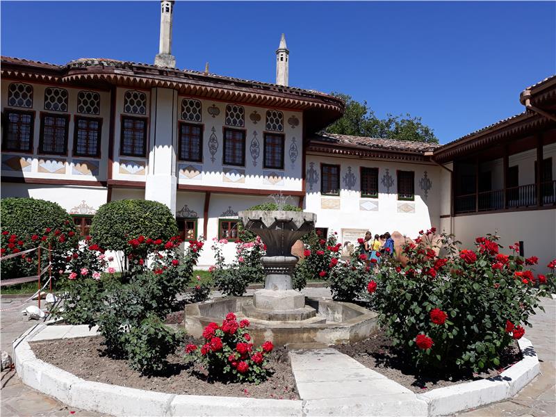 Над Гаремом высилась Соколиная башня, сооруженная, вероятно, в первой половине XVIII в. По преданию, в нижней части башни содержались соколы, обученные для охоты, и, кроме того, сюда разрешалось подниматься обитательницам гарема, чтобы посмотреть на окружающий мир, на пеструю, красочную жизнь дворца. Восьмигранная деревянная башня поставлена на кубическом каменном основании, высотой равном высоте стен, окружающих двор. Верхний ярус башни представляет собой сквозную решетку; верх покрыт черепицей и увенчан позолоченным навершием. Внутри башни широкая открытая лестница, огибающая все ее грани и ведущая на смотровую площадку наверху, впечатляет своей грандиозностью. Вертикаль башни — важный элемент архитектурной композиции, скрепляющий ансамбль дворцовых киосков с их двориками и садиками, соединенными друг с другом крытыми переходами. Если смотреть сверху, — а такая возможность неоднократно представится во время прогулок по городу, — то башня эффектно подчеркивает живописность многоуровневой черепичной кровли дворцового комплекса, выросшего стихийно и объединившего сооружения разных эпох и стилей.