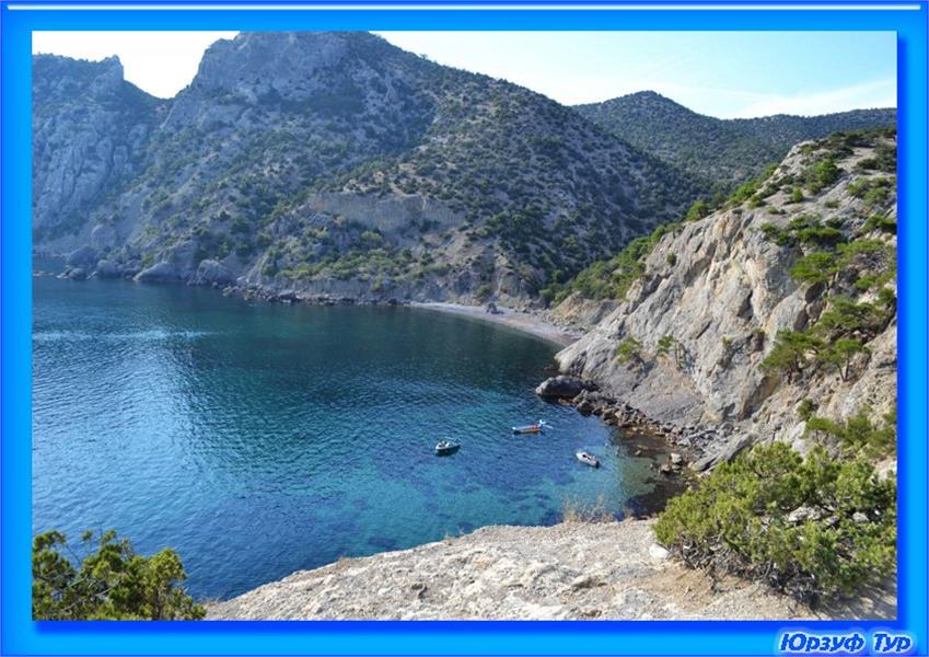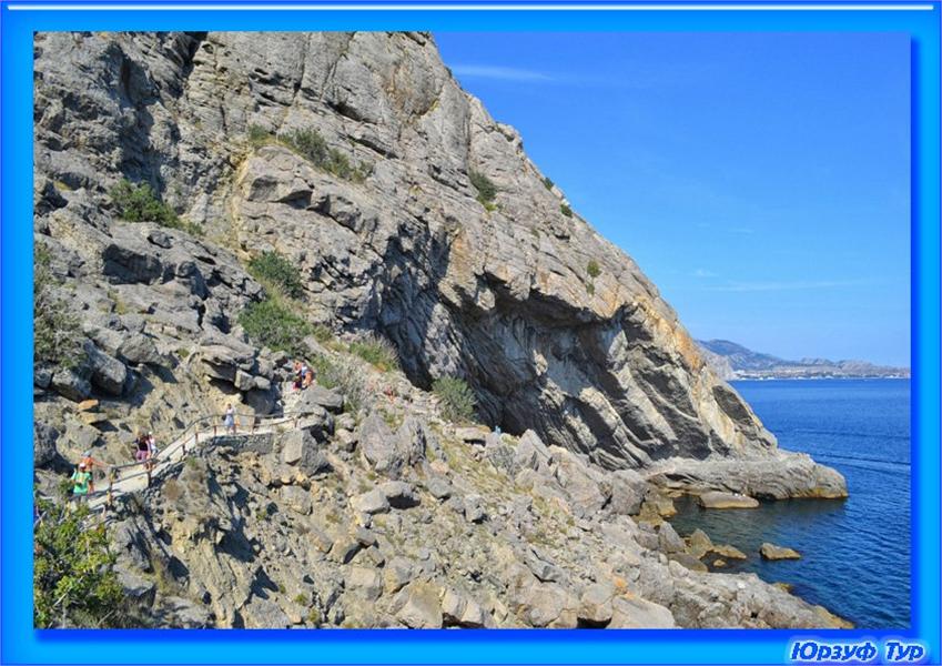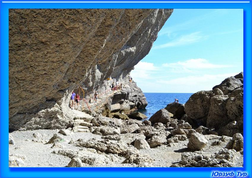 Голубая бухта знаменита Царским пляжем под горой Караул-Оба. Попасть на Царский пляж можно двумя способами: горными тропами через Можжевеловую рощу или с комфортом – на катере. Перевозка желающих понежиться на солнышке Царского пляжа местным населением превращена в целую мини-индустрию. Отдыхающих сюда привозят из Судака целыми катерами, поэтому в сезон и так небольшой пляж становится совсем тесным. «Царским» пляж называется не потому, что здесь отдых по-царски, а потому что на этом пляже отдыхал царь. Случилось это значимое в истории Нового Света событие 15 июля 1912 года, когда последний Император Российской империи со свитой прибыл по приглашению князя Л.С.Голицына осмотреть Новый Свет и вступить во владение винными подвалами. До самого пляжа была устроена тропа, вырубленная в скале. После землетрясения 1927 года ограждение тропы обрушилось, и проходить по ней стало очень опасно. Часть тропы – до Сквозного грота – восстановили, а участок от Сквозного грота до Царского пляжа так и остался не восстановленным. Догадайтесь, почему.